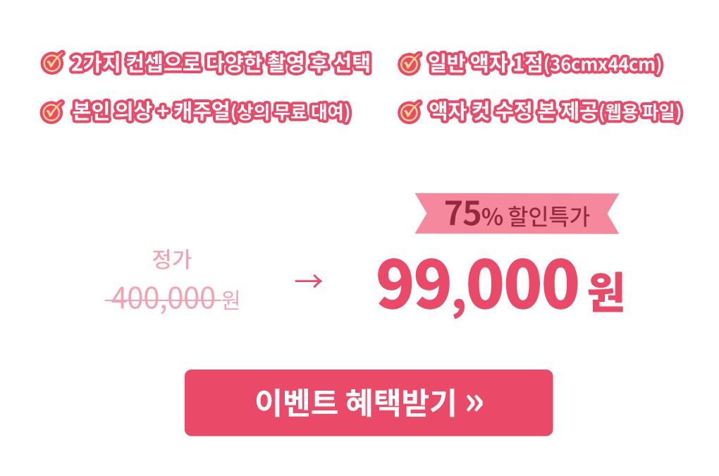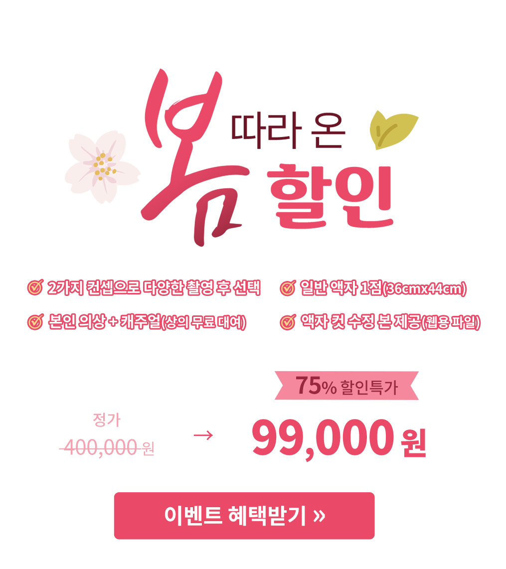 •  촬영 스케줄 확정 후 30일 전 취소(50%), 14일 전 취소(10%), 7일 전 취소는 환불이 불가능합니다.
